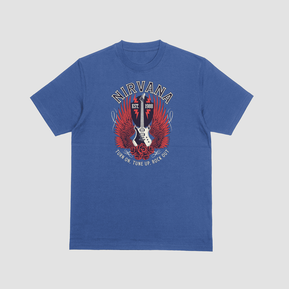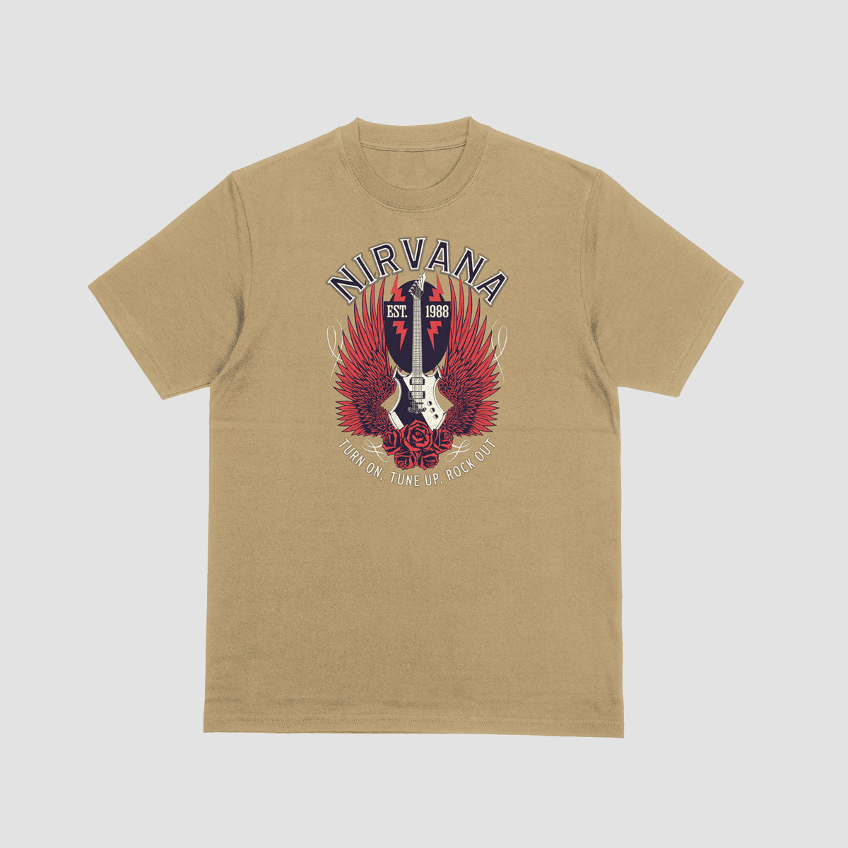Embrace the spirit of a generation with our Nirvana wings tee. This shirt features a powerful graphic of a winged electric guitar rising from a bed of red roses, perfect for anyone who lives for the music.